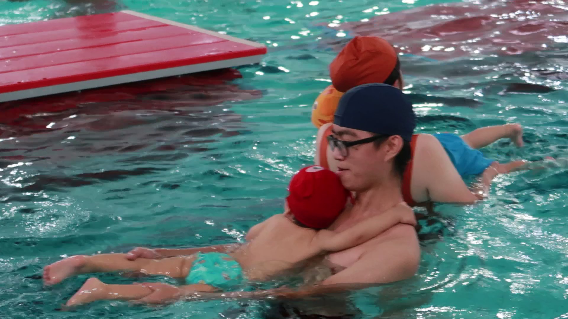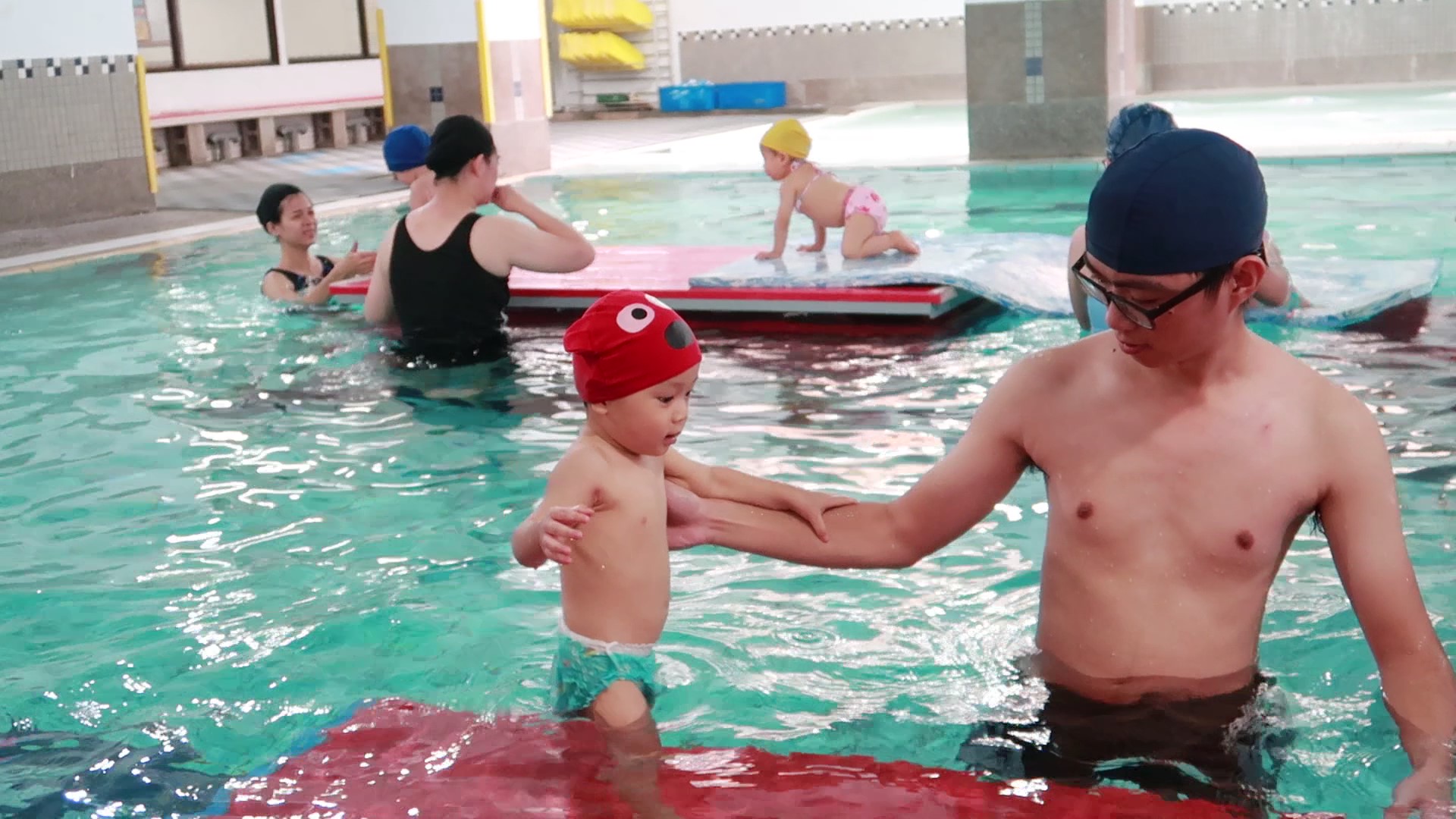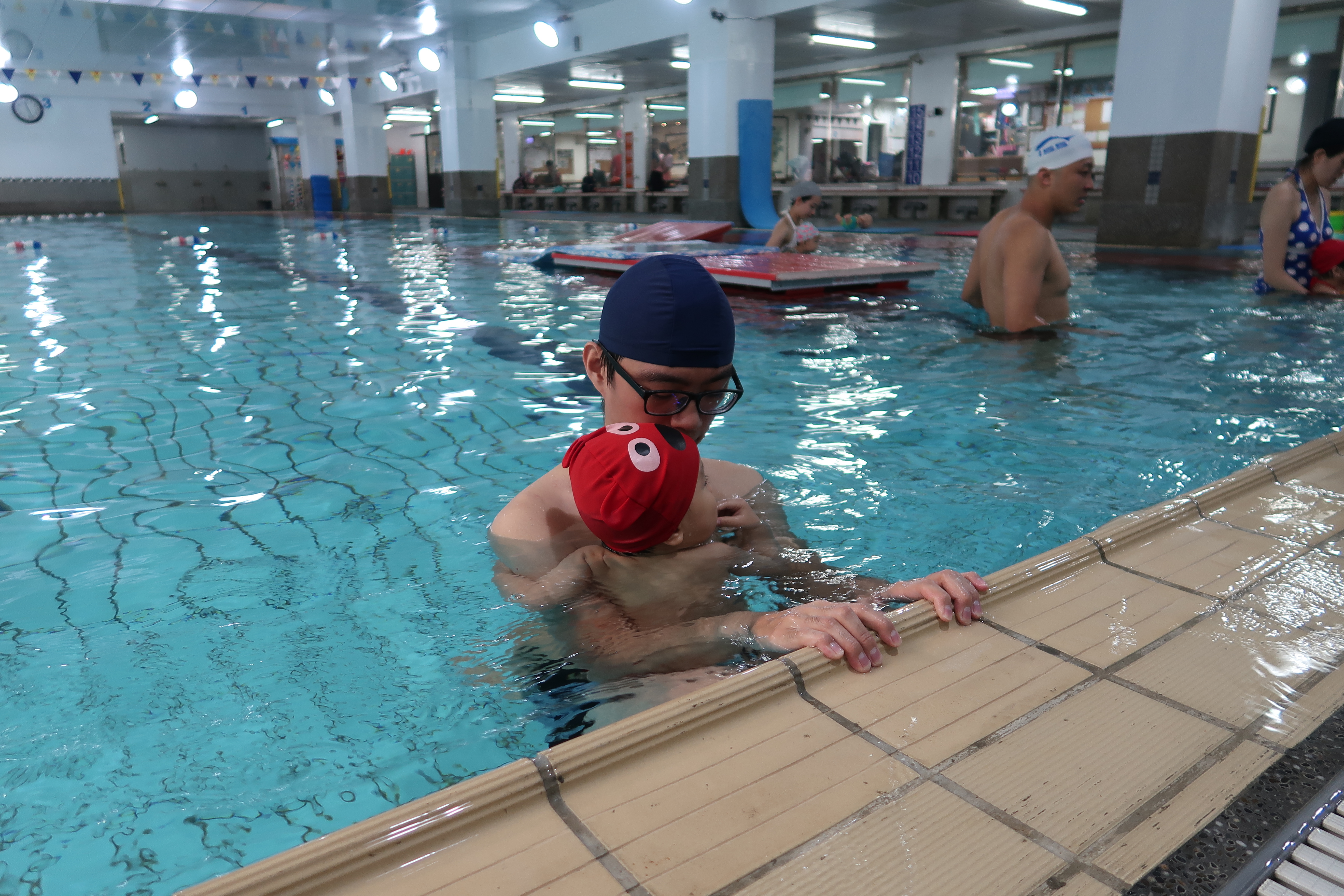 有次機會免費報名上爸媽育學堂的親子游泳課程,由人人伊藤萬游泳學校的專業師資來教學,泳池室內的溫度和水溫都是恆溫的狀態。下水前教練拿著假寶寶帶著做暖身運動,讓爸爸媽媽可以邊看邊幫寶寶做,不過兒子看到游泳池又開始害怕咬著手手,直到下水後有教練的引導和互動,慢慢地看到孩子臉上的笑容和笑聲,我的心情也跟著愉快!!